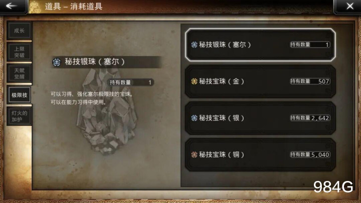 金银铜三种珠子需要从职业塔、活动中慢慢积累,需要哪个角色升十必时再消耗,没事尽量别乱用,点几下就没了;金银铜三种导石,除了金导石日常不够用之外,银铜导石早已溢出,留着换天启印。