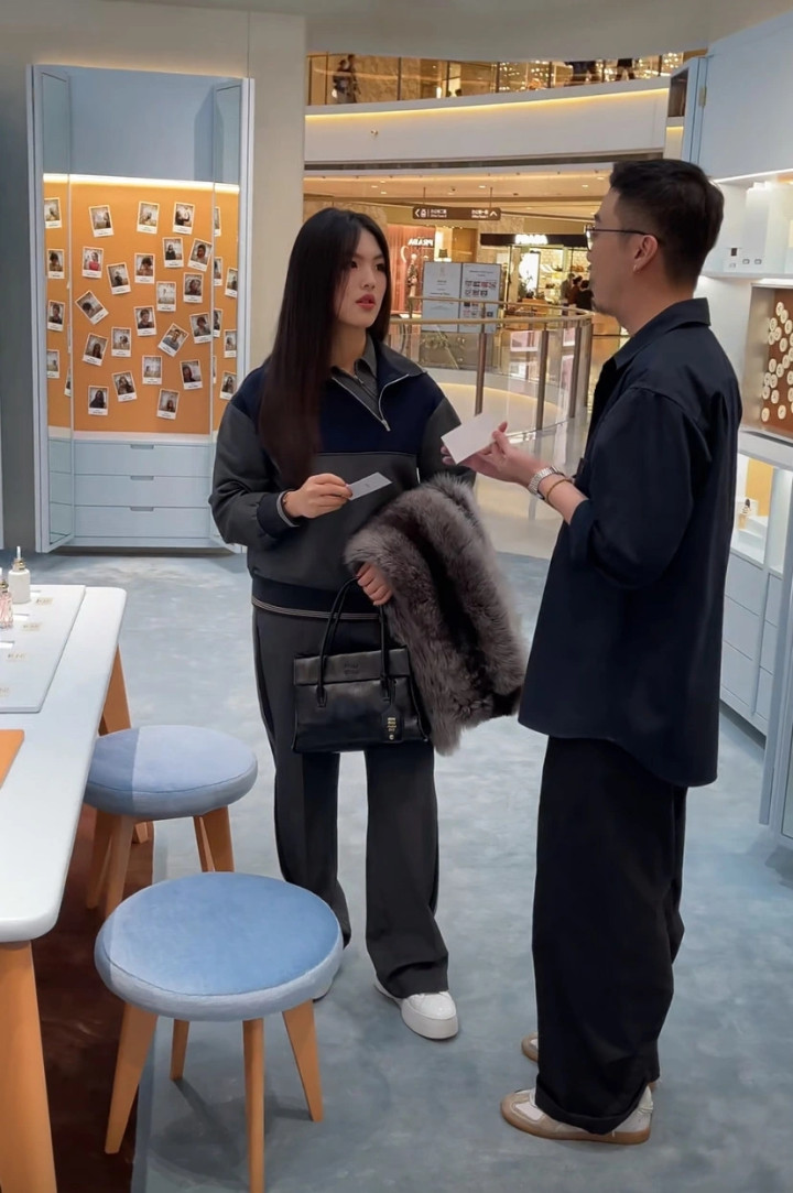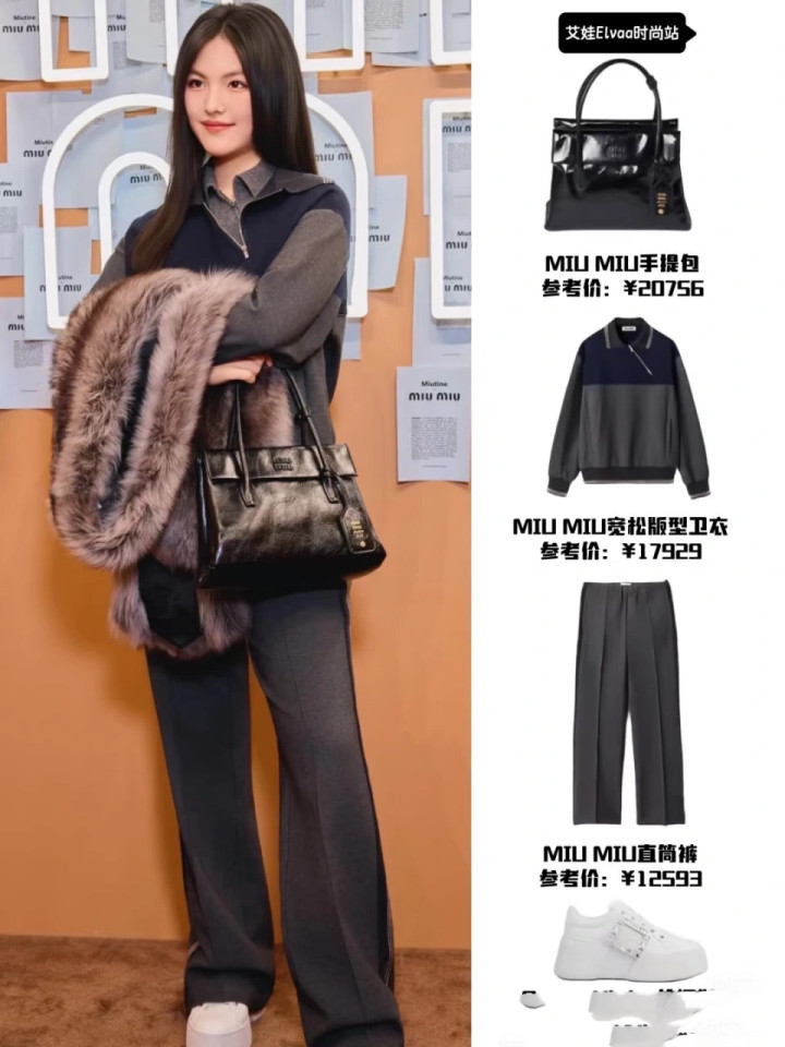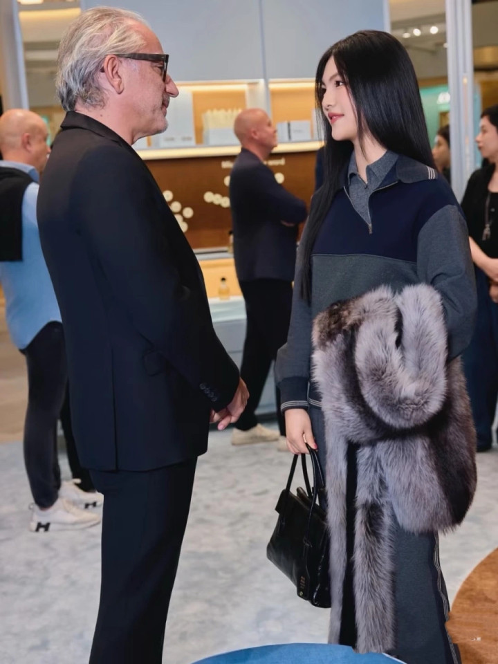 这次活动,她虽然换上了简约套装,但手里的那只皮草围巾、高级感包包,还是暴露了她“土贵”气质的根源。