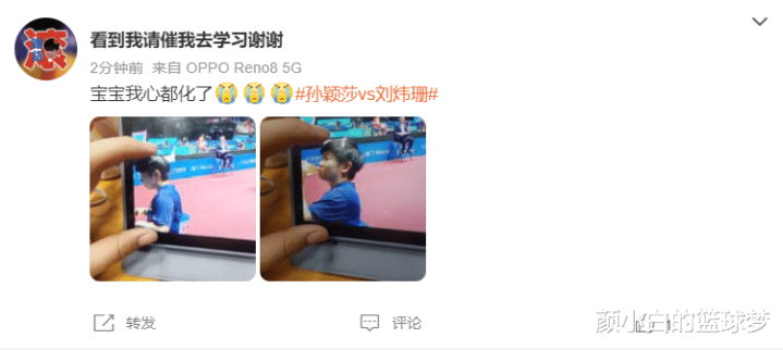 很多人都晒出直播时孙颖莎场边喝水、擦汗的瞬间,都觉得孙颖莎这一幕太可爱了。