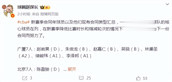 CBA有5队有多达11人处在合同年,分别是上海、同曦、深圳、江苏与宁波;有2队有9人处在合同年,分别是山东与四川;有3队有8人处在合同年,分别是北控、天津与吉林;有4队7人处在合同年,分别是浙江、广厦、北京与广州等。
