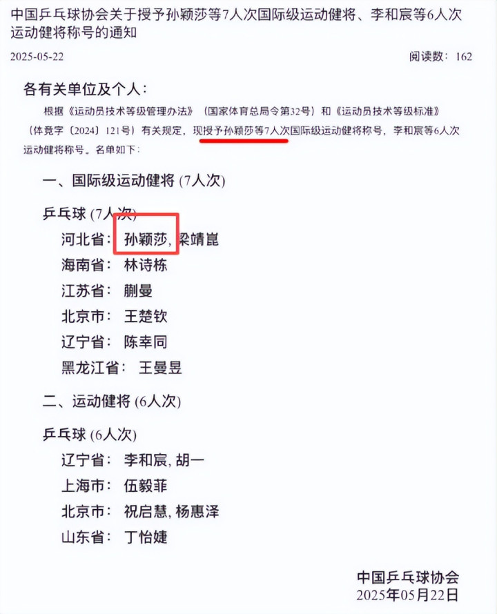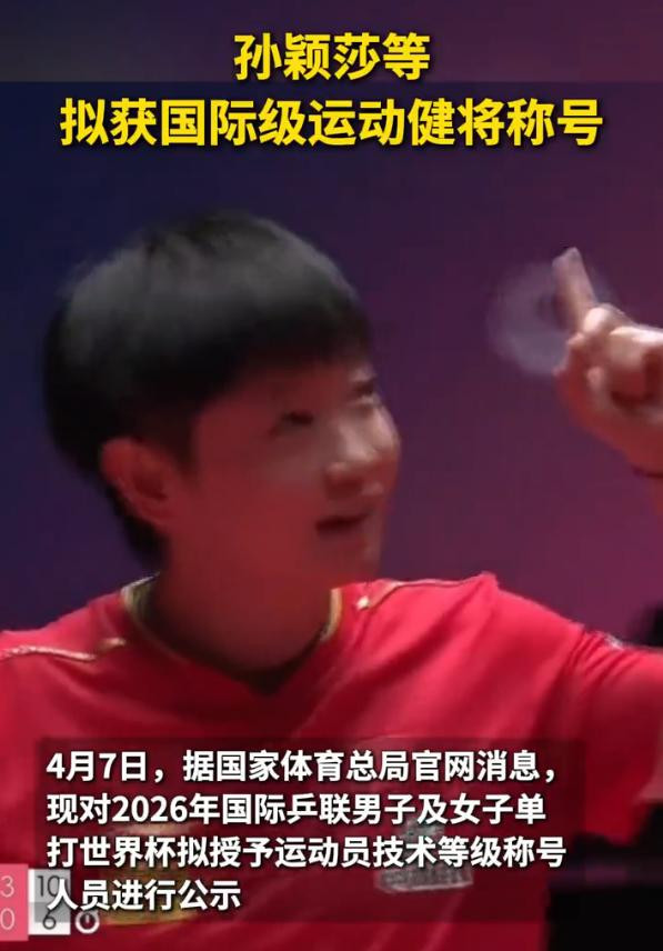 4月7号,国家体育总局官网发布公示,亲自官宣,拟授予孙颖莎“国际级运动健将”称号。
