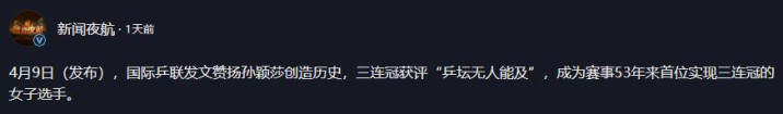【1】2026年4月9日发布 新闻夜航《4月9日(发布),国际乒联发文赞扬孙颖莎创造历史,三连冠获评“乒坛无人能及”,成为赛事53年来首位实现三连冠的女子选手。 》