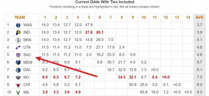 国王目前和爵士都是22胜59负,但爵士因为交手战绩排在西部倒一,因此爵士的选秀顺位比国王高,具体如下图: