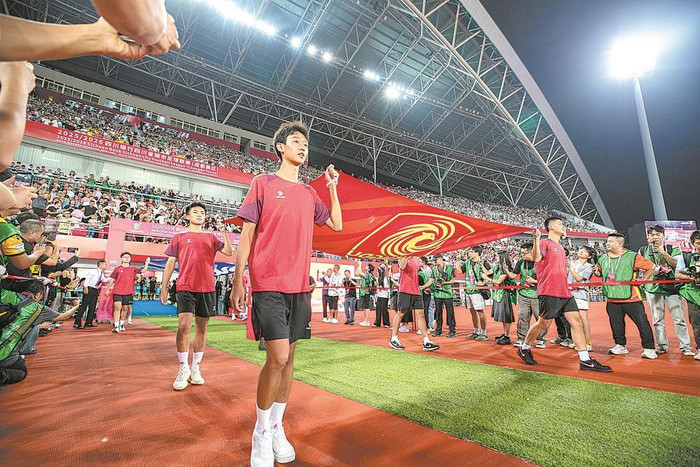 21个市州代表队相继入场,压轴出场的成都锦城队的旗手是四川足球名宿姚夏,熊猫界顶流“花花”、奥运冠军冯喆、巴蜀笑星廖健、知名企业家曹世如和成都歌手冯家妹组成锦城天团,为球队打CALL。主队亮相,在全场最响亮的欢呼声中,场地上组成了太阳神鸟图案。像成都那样“足”够精彩!这不仅是队伍的宣言,更是成都这座城市的态度——开放、活力,敢拼,敢赢!