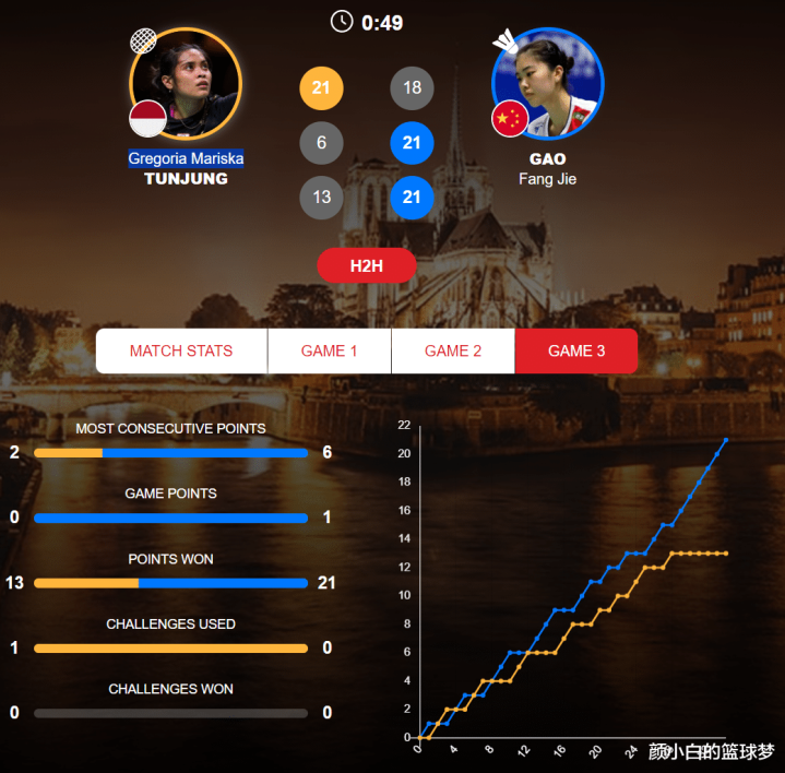 第三局开场两人非常胶着,从1-1鏖战到6-6,转折点就是高昉洁连拿3分9-6反超后,随后高昉洁15-13继续领先,打到这里玛丽斯卡的心态明显开始失衡,她的自失开始增加,高昉洁趁势打出6-0的攻势直接带走比赛21-13。