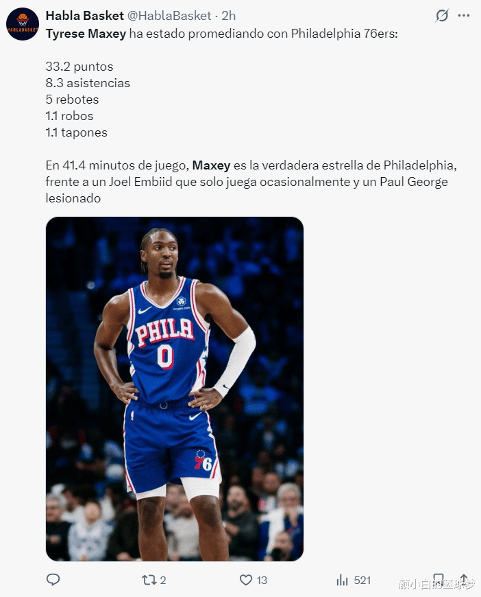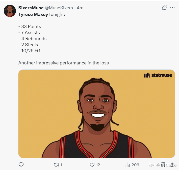 马克西是上周的东部周最佳,美媒晒出了他新赛季10场比赛的数据,这10场比赛他已经拿到332分83助攻50篮板,也就是场均33.2分,费城的新艾弗森就此诞生了。