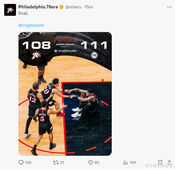 北京时间11月10日,费城108-111惜败活塞,这场比赛是拉锯战,上半场打完是费城领先,第三节打完活塞反超,末节两队鏖战至最后一刻,坎宁安命中准绝杀,马克西三分绝平没中。